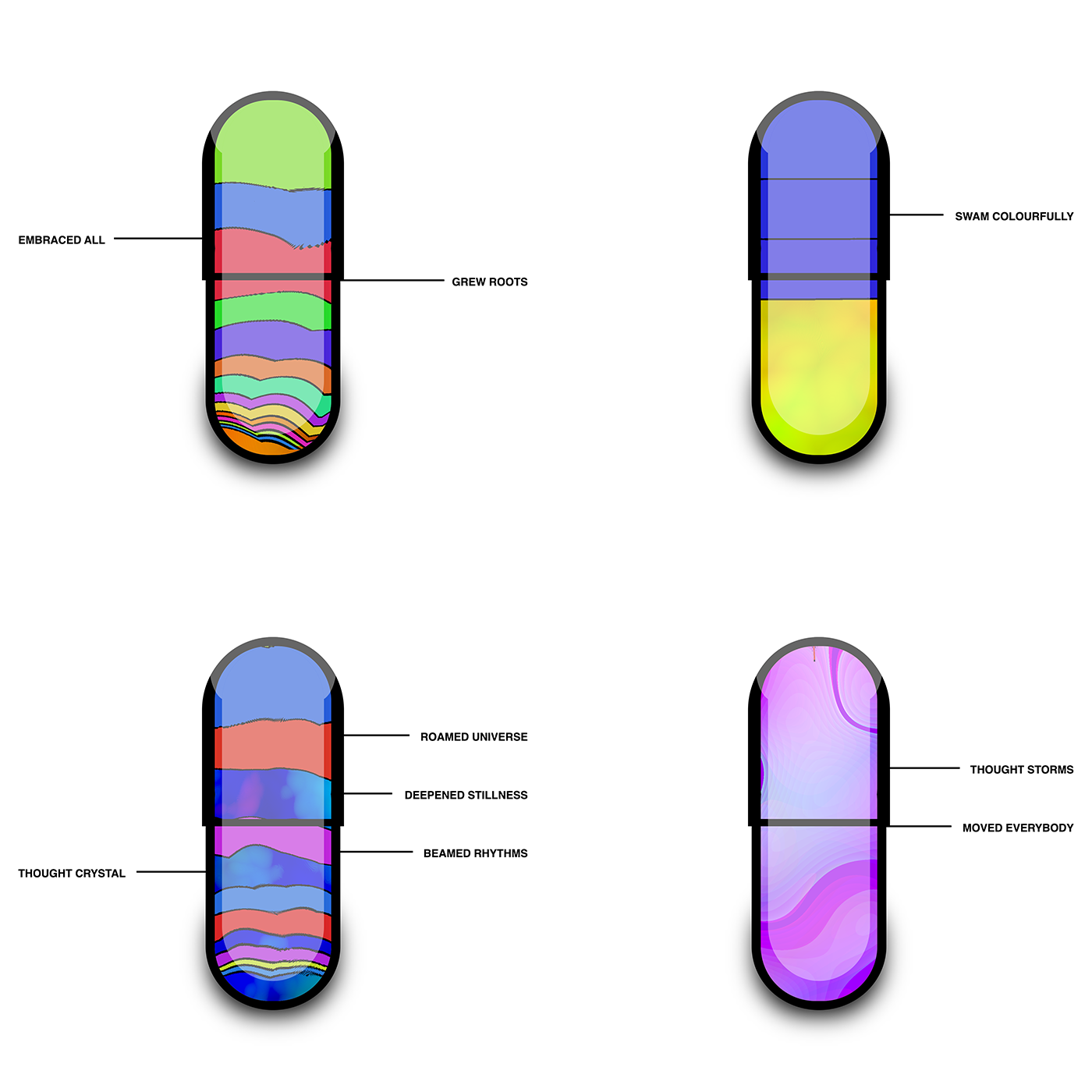 The capsules are visualizations of the lives of each uploaded mind. Due to them wanting to unlearn to ease their struggles, each capsule can vary in terms of how glitchy and messy it is. Some uploaded minds manage to remember more of their past and it is thus more orderly. Some uploaded minds marked their capsules with core experiences that defined who they had become.